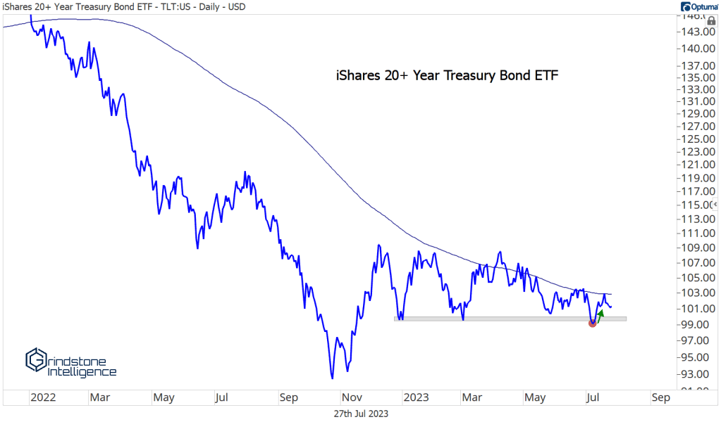 Check out TLT, the long-term Treasury ETF. It’s below a flat/falling 200-day moving average, but it hasn’t really deteriorated since setting a swing low at year-end. As long as TLT can continue to hold above that key level of support, we think the higher probability outcome is for higher stock prices.