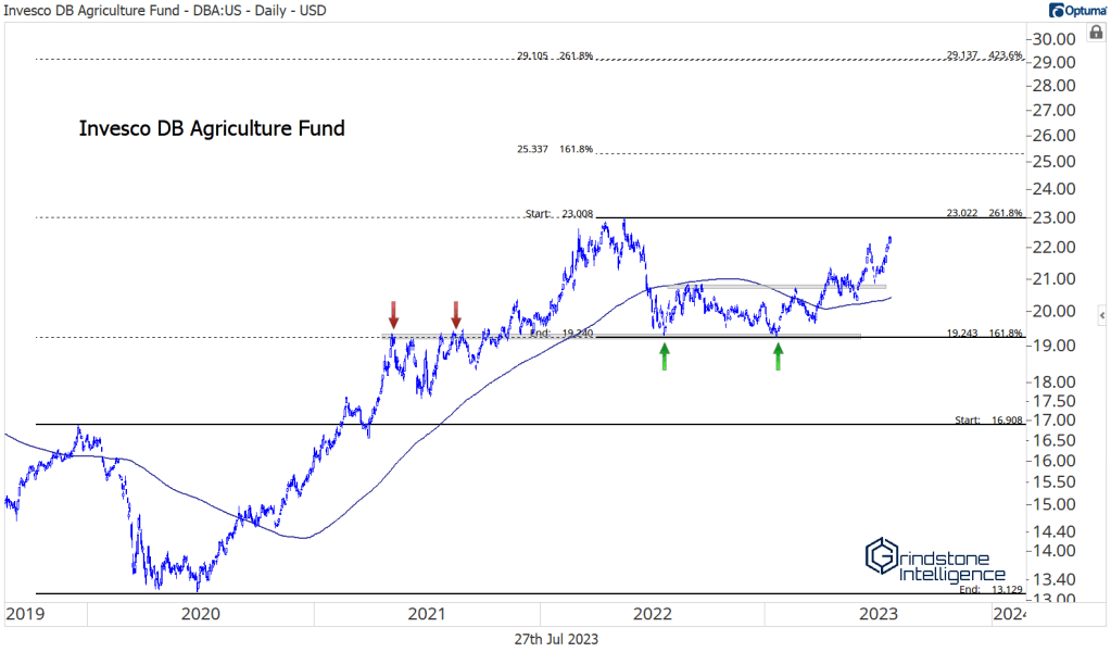 DBA might be the easiest way to play the strength in Ags. It’s not breaking out to new all-time highs, but we’re nearing a challenge of last year’s peak at $23. On a breakout, we’re looking at an initial target of $25.30, with the idea that longer-term we could go all the way up to $29.