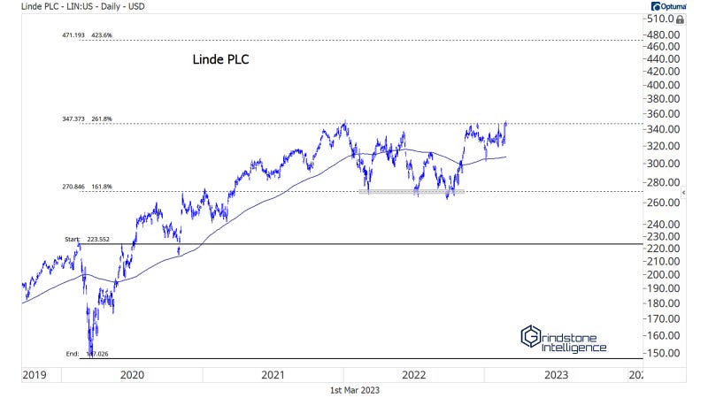 Our view on Linde hasn’t changed – it’s still battling its January 2022 highs, but if it breaks above 350, we think it’s headed to 470.