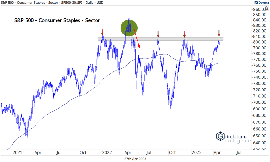 We’re watching this resistance level around 810 on the chart very closely. If Consumer Staples are above that level, we can’t be anything but bullish on the sector.