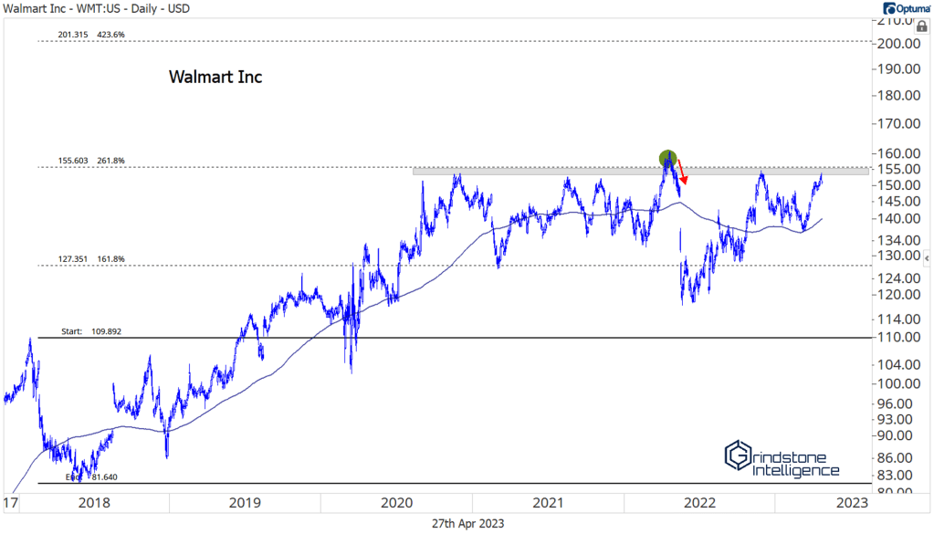 Walmart is nearing the top end of a 3-year trading range, the top of which is the 261.8% retracement of the 2018 decline. We want to be buying breakouts from this big base with a target of 200. In that scenario, expect the entire sector to be moving to new highs as well. If WMT is below 155, though, we need to leave it alone.