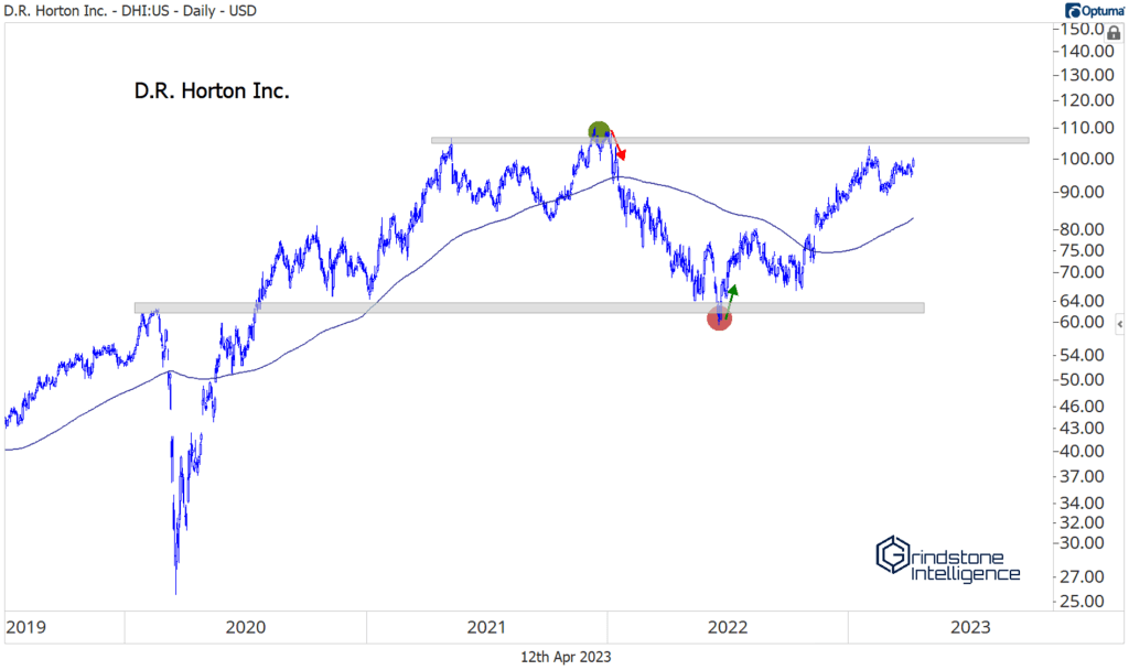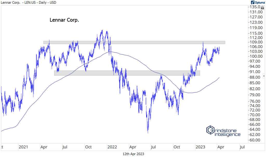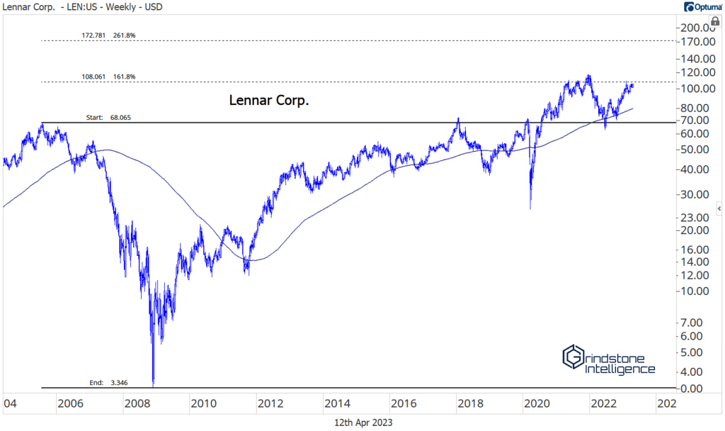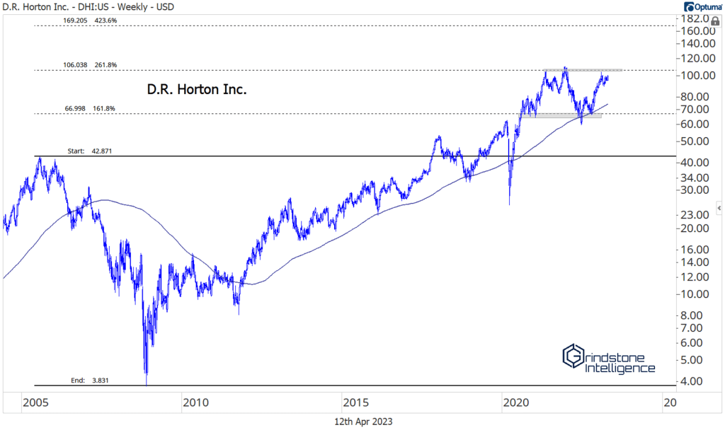 The multi-year consolidation in the homies started at a pretty logical level. For D.R. Horton, the nation’s largest homebuilder, the 2021 peak coincided with the 261.8% retracement from the entire 2005-2008 decline. The stock then bottomed last June at the 161.8% retracement. Ever wonder why we use these Fibonacci levels? This is why. The market respects them. It doesn’t really matter whether we believe in the merits of ancient math. The market does.