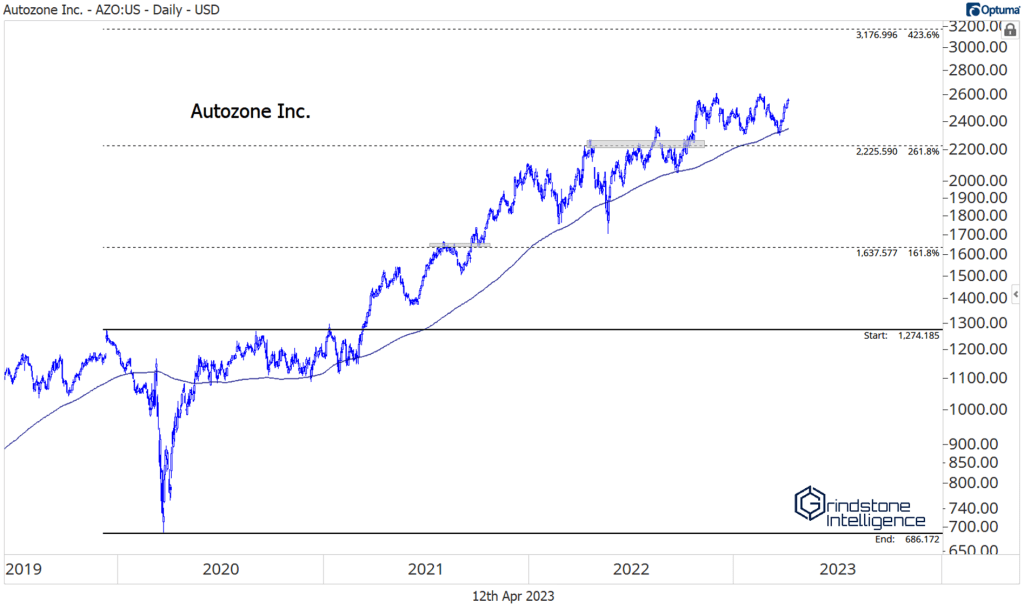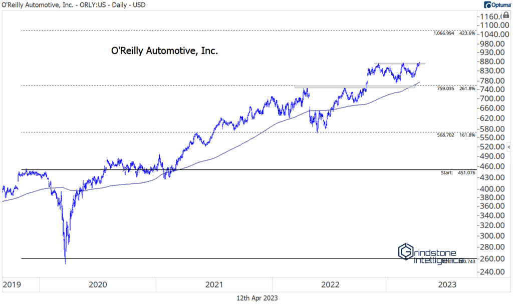 If you absolutely must have exposure to autos, check out the auto parts retailers. Autozone and O’Reilly have been on our radar for awhile, given the overwhelming amount of relative strength they’ve shown. Both have spent most of the last 3 years above rising 200-day moving averages, and now both are nearing new highs again after a few months of healthy consolidation. For both, we’re using the 423.6% retracement from the COVID selloff as a longer-term target. For AZO, that level is $3,176. For O’Reilly, $1,066.