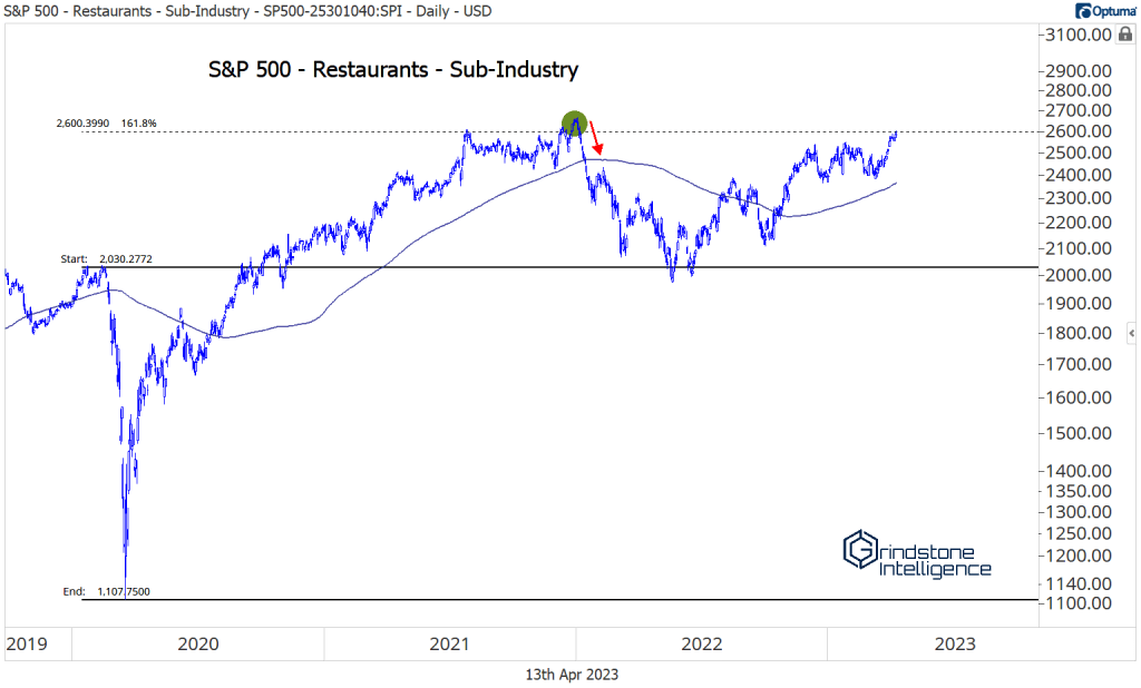 If we zoom back out to the sub-industry level, we’re also seeing a lot of strength within Restaurants. This group peaked in 2021 at the 161.8% retracement from the COVID selloff, and it’s spent the last two years trying to absorb that supply.