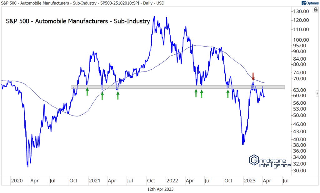 Where we don’t see a lot of strength is in the Auto Manufacturers. The chart for that sub-industry belongs in a textbook as an example of polarity. For most of 2021 and 2022, $65 was support. In November, that support finally gave out, and the group fell to multi-year lows. Now, $65 is acting as resistance. We don’t want to own any auto manufacturers as long as the sub-industry is stuck below that level.