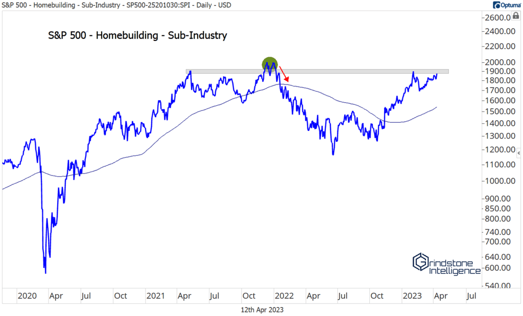 Luckily, we as investors aren’t limited to investing in indexes or holding just the largest stocks. We can dig beneath the surface. The S&P 500 Homebuilders Sub-Industry is nearing a breakout to new highs.