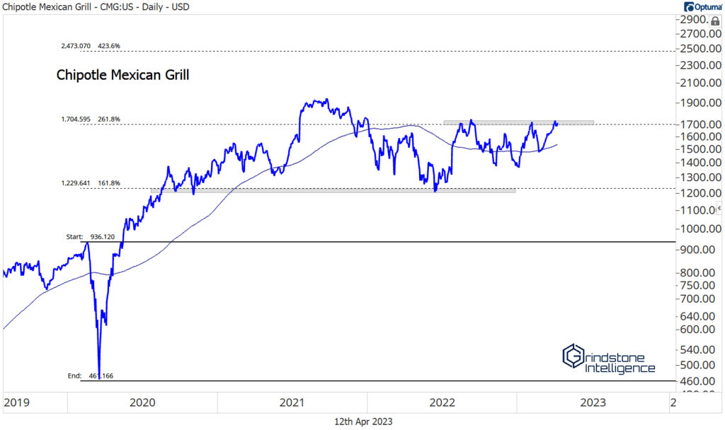 Chipotle is nearing a breakout above $1700, which has been the ceiling for the last year and coincides with the 261.8% retracement from the 2020 decline. On a move above that resistance level, we’re targeting a move all the way up to $2,470, which is the next key retracement level.