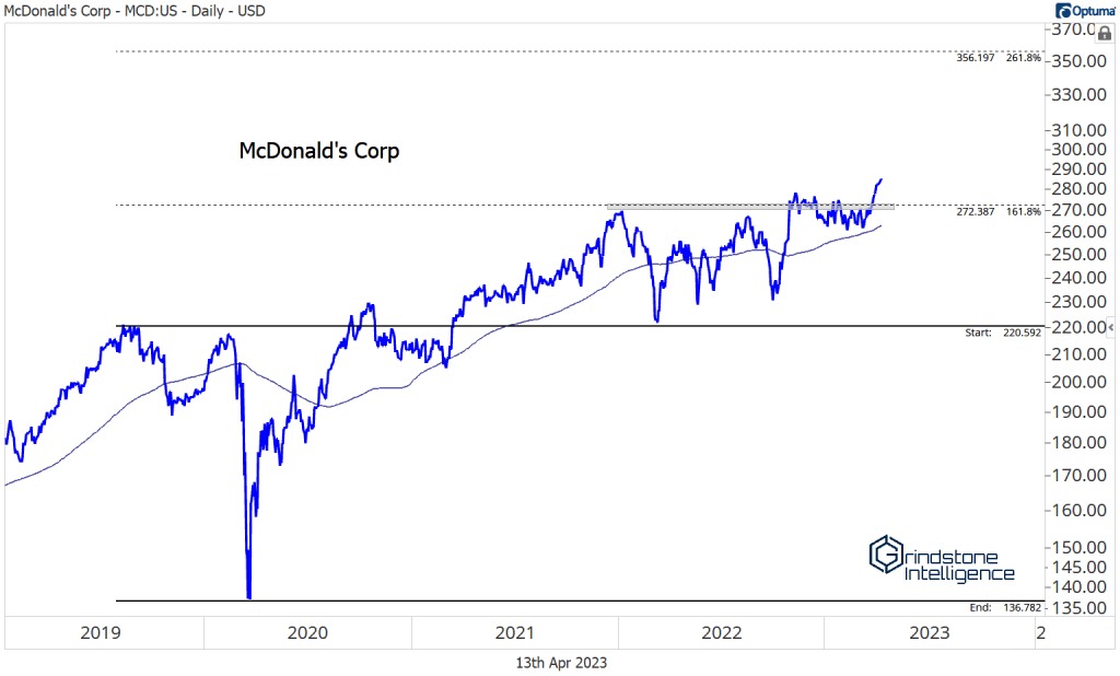McDonald’s has already succeeded. It’s setting new all-time highs, and we like it long with a target up near $356, which is the 261.8% retracement from the 2019-2020 selloff. Support is at $270.