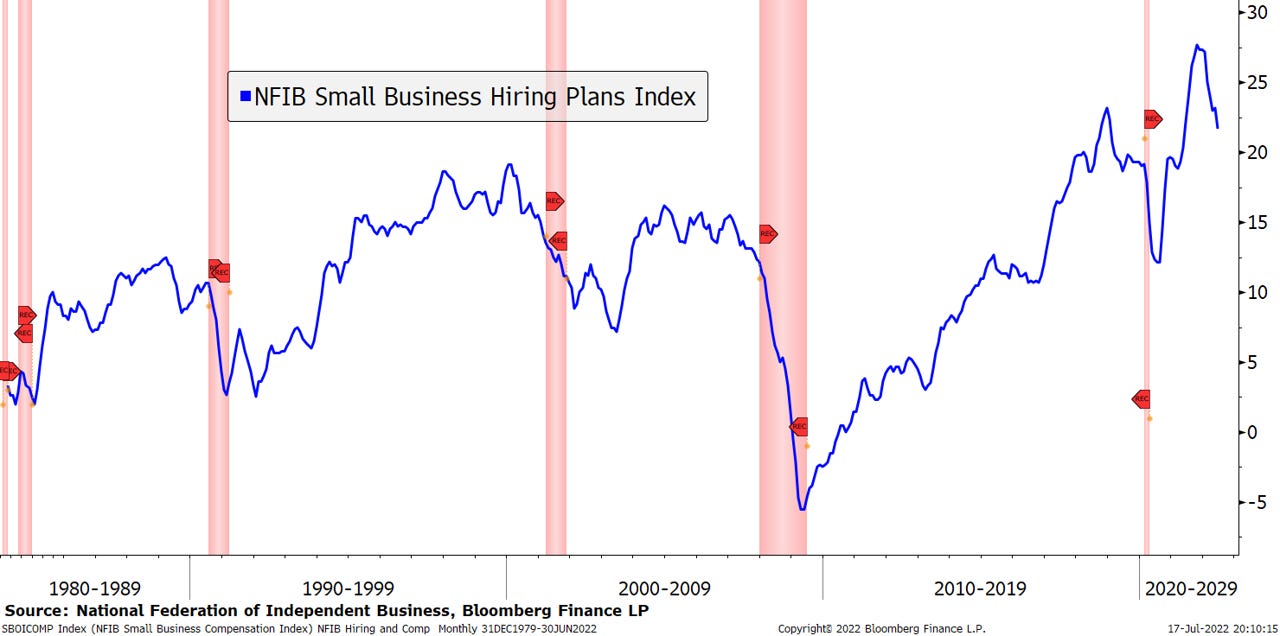 We can also look at survey data to assess the labor market’s future. Every month, the National Federation of Independent Business asks small business owners about operating conditions and their outlooks. Included is a question about hiring plans. Hiring plans tend to fall ahead of economic downturns, as owners batten down the hatches in preparation for weaker sales. It seems they’re pulling back on hiring now.