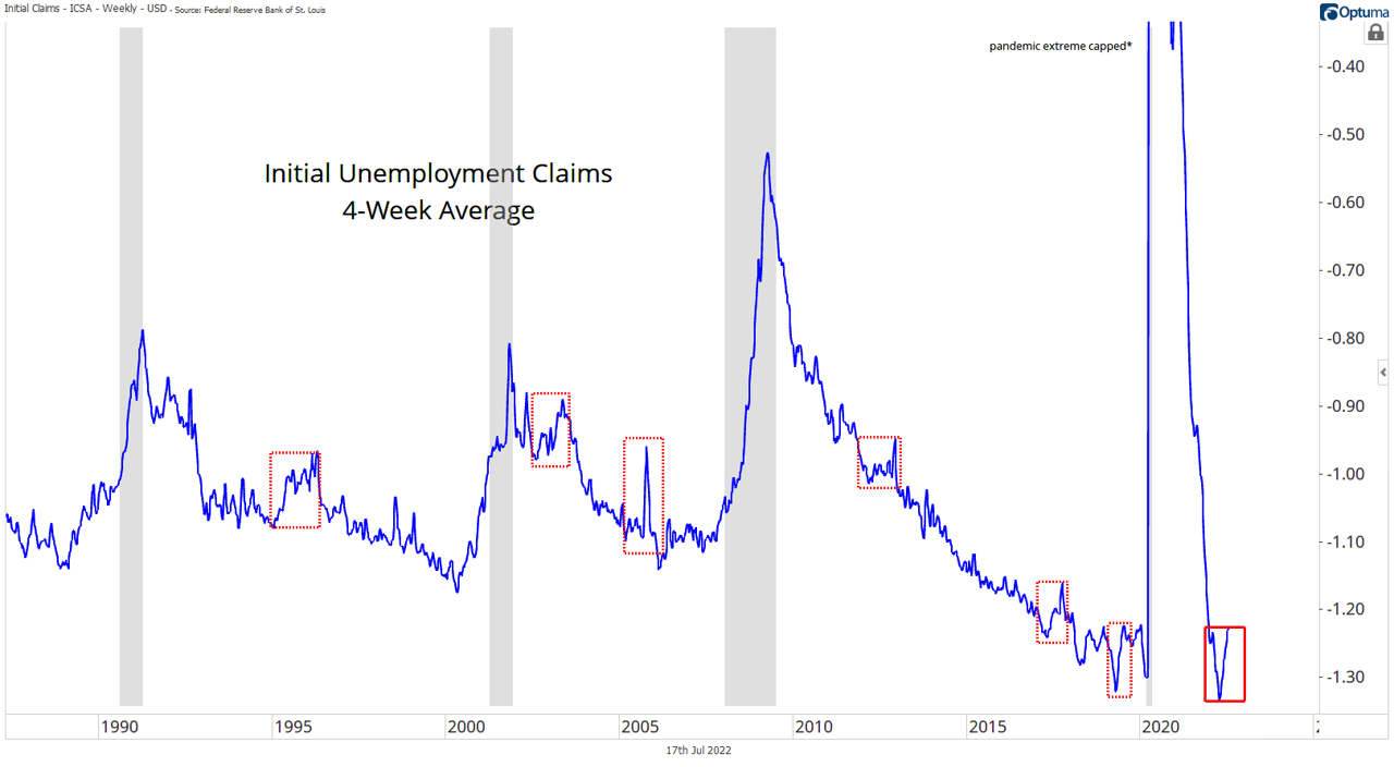 But just because some traditional warning signs aren’t confirming the economic slowdown doesn’t mean there are no signs of stress in the labor market. Initial unemployment claims are rising. They tend to be much more volatile from week to week than continuing claims, so trend changes can be harder to identify – a four-week moving average makes it clear that this data set is headed in the wrong direction this summer. Still, similar spikes in the past haven’t always resulted in recessions. Check out the multiple such instances in the ’90s, ’00s, and ’10s that were followed by continued economic growth.
