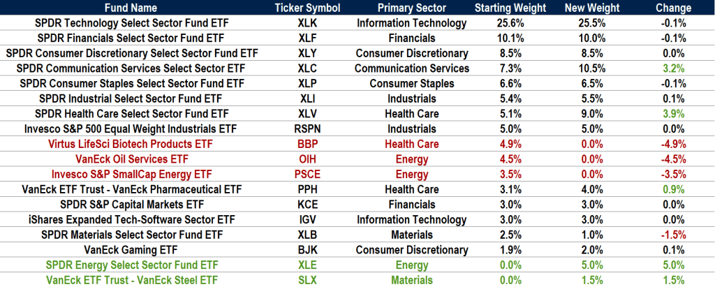 We’re making the following changes to the model portfolio, reflecting our sector ratings update and some recent shifts in market leadership. The changes will be effective at the closing print on October 3. The table below details the adjustments and the new positioning.
