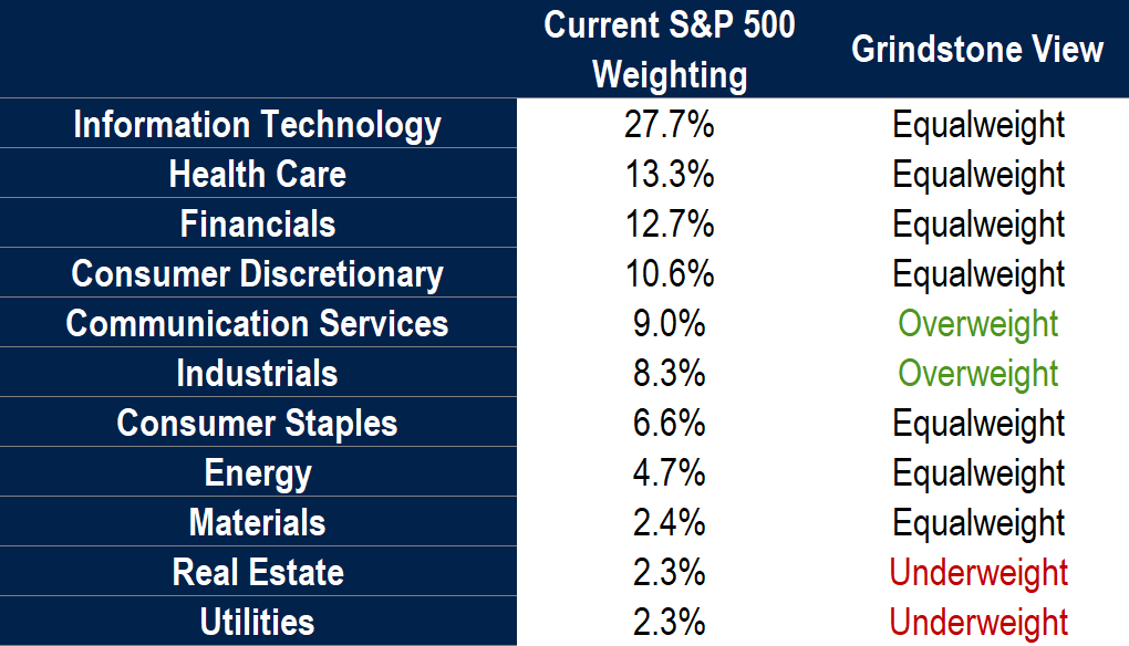 We’re upgrading Communication Services to Overweight, in response to the sector’s unrelenting strength, and downgrading our view of Energy to Equalweight after a healthy run of outperformance. We’re keeping our Underweight ratings on Utilities and Real Estate, and maintaining our Overweight rating on Industrials.