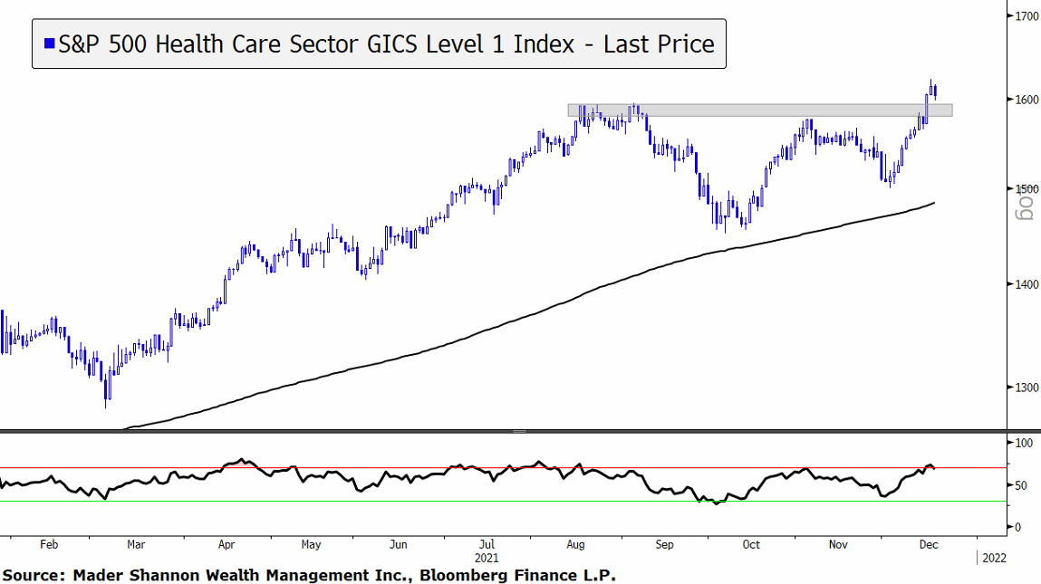 Health Care, Real Estate, Consumer Staples, and Utilities have each outperformed the S&P 500 Index by more than 5% since mid-November.