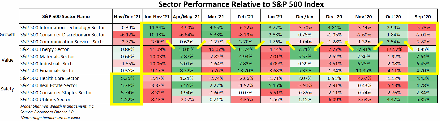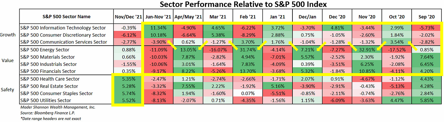 Since last September, growth-oriented sectors and their value-tilted counterparts have alternated in leadership roles to propel U.S. stocks steadily higher. One month would be dominated by Information Technology, Consumer Discretionary, and Communication Services, and the next by Energy, Materials, Industrials, and Financials. The only consistent action has come from the group more commonly associated with risk aversion – Safety sectors underperformed in virtually every period. Until now that is.