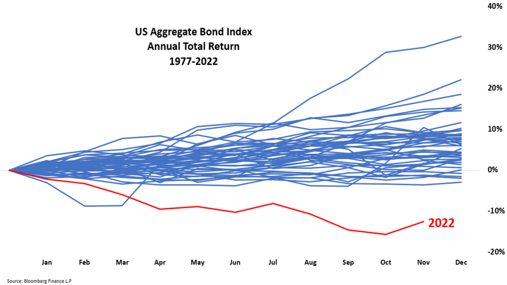 When stock prices are under pressure, investors often flee to fixed income for safety. Bonds offered no such safety this year. Of the last 50 years, 2022 stands alone.