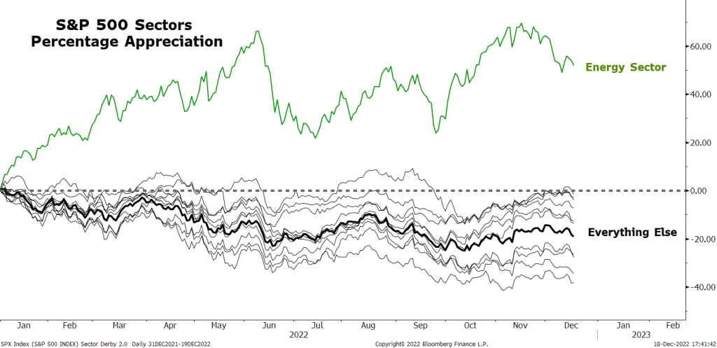 The bond market didn’t offer safety to investors, and neither did anything else. Except for Energy. The S&P 500 Energy Sector has risen more than 50% this year after being the top performing group in 2021 as well. Following a decade of underperformance, I guess Energy was due for a good run.