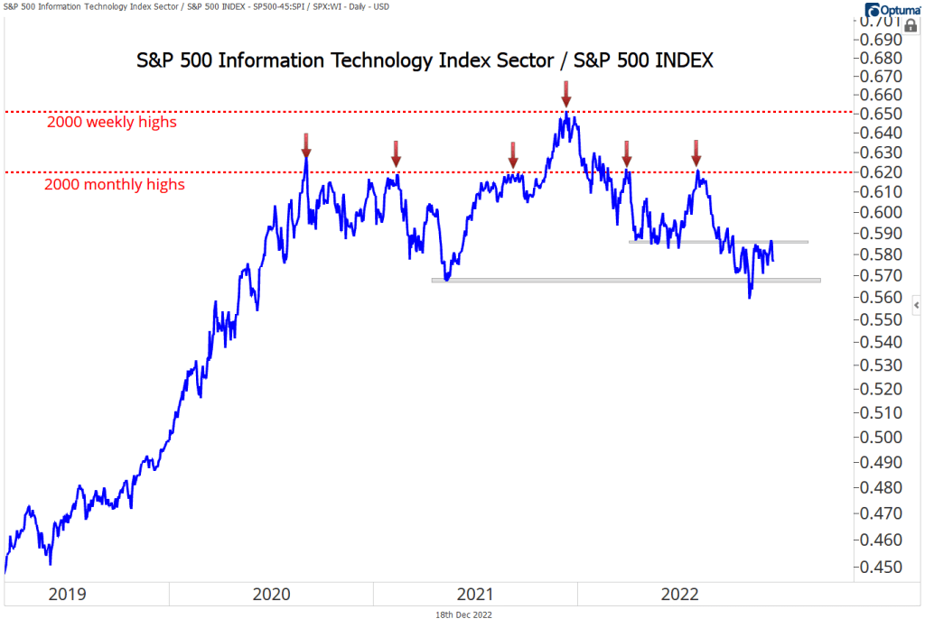 This has been one of my favorite charts all year and will continue to be in 2023. Information Technology stocks ended a decade-long run of outperformance when they ran into their Internet Bubble highs on a relative basis. Think prices from more than 20 years ago don’t matter? Check out the chart below.