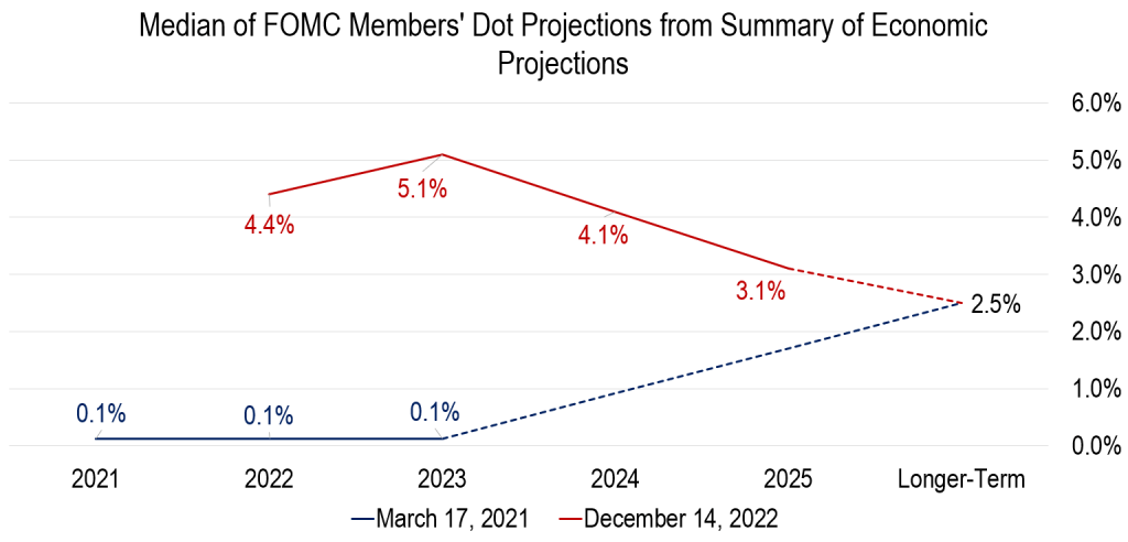 Instead, the Federal Funds target rate has been lifted by 4.25% in 2022. FOMC participants believe they’ll need to raise it above 5% next year.