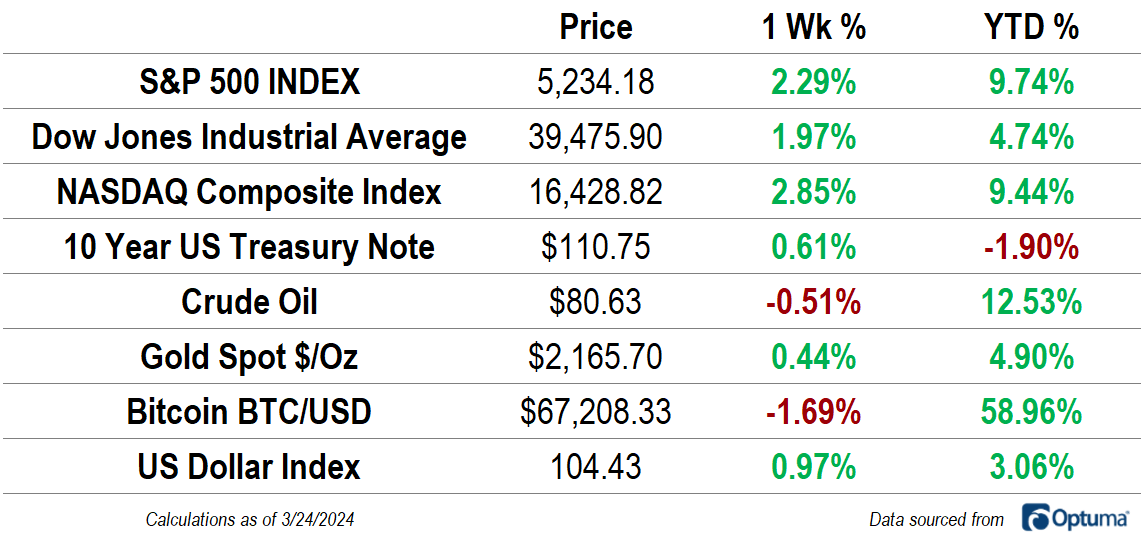 The S&P 500 followed up two consecutive weeks of declines with its best performance of the year, rising 2.3%. For each the S&P 500, Dow Jones Industrial Average, and the NASDAQ Composite, prices closed reached their highest levels of all time. Surprisingly, the strength in stocks coincided with a rally in the US Dollar Index, which had its best weekly close since last November. During the bear market of 2022, a strong Dollar meant week stocks, but more and more, that correlation seems to have died out.
