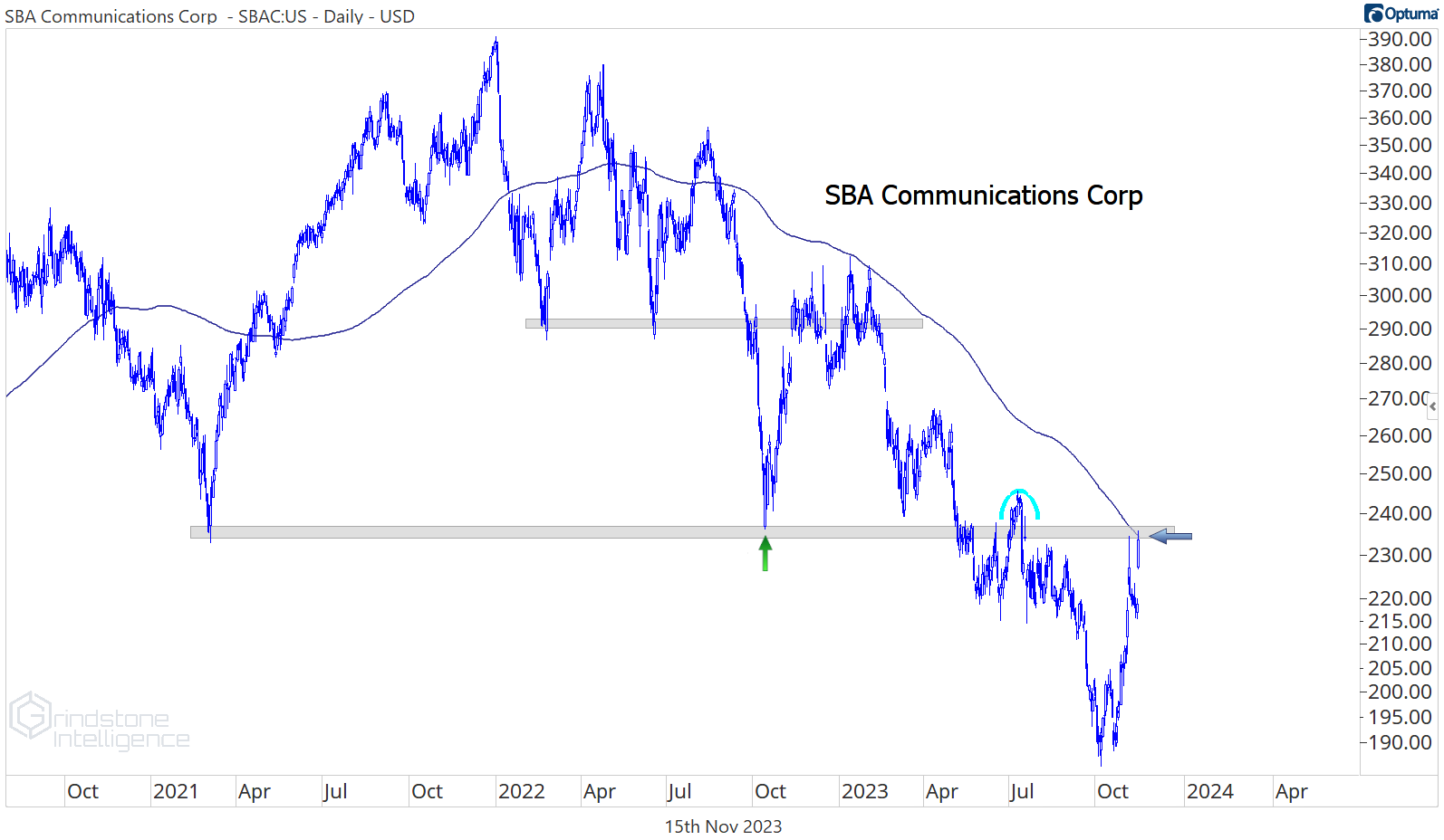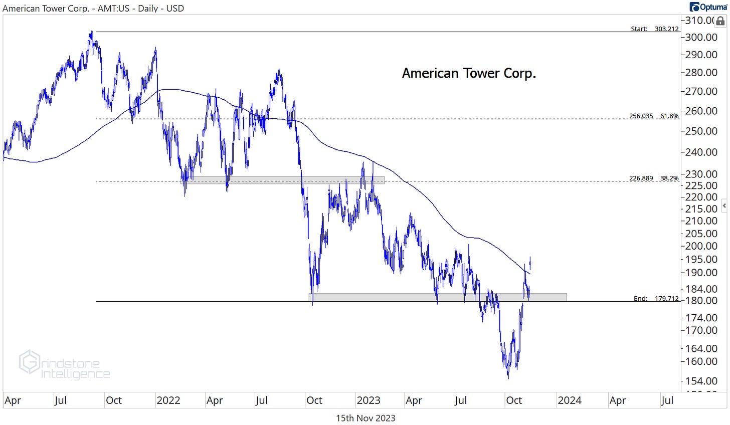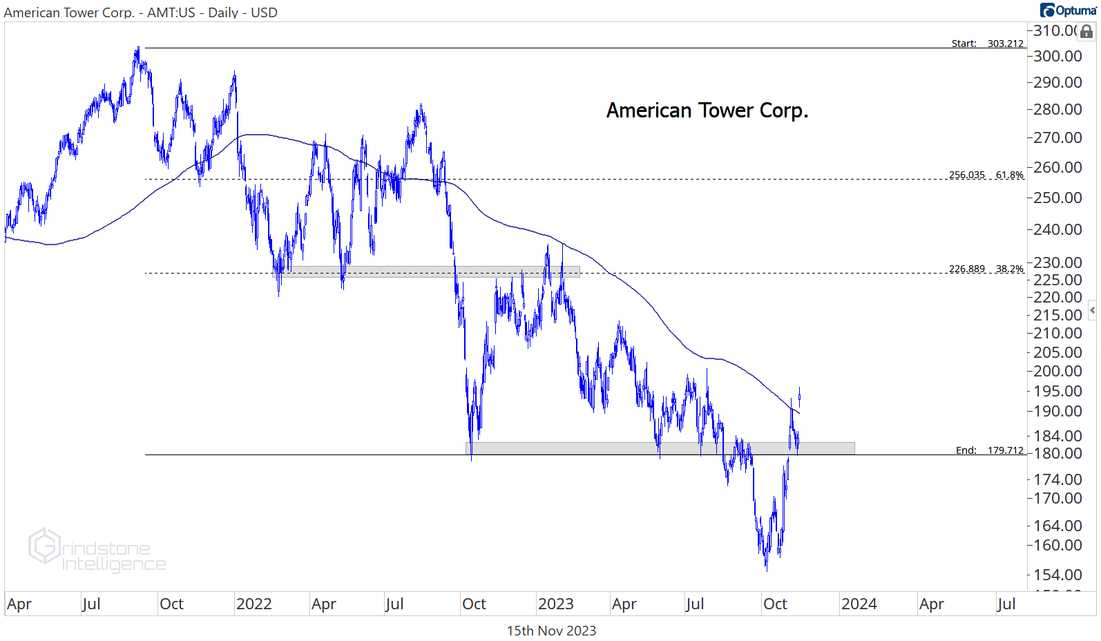 The Telecom tower REITs are worth watching, too. That sub-industry was the worst-performer for most of the year, but it was the first to find a bottom in October. The ensuing rally has pushed American Tower back above last year’s lows and above its 200-day moving average for the first time in over a year. We think AMT is worth owning above $180 with a target of $225, which is the 38.2% retracement from the 2022 decline and also has been a key rotational level for the last 18 months.