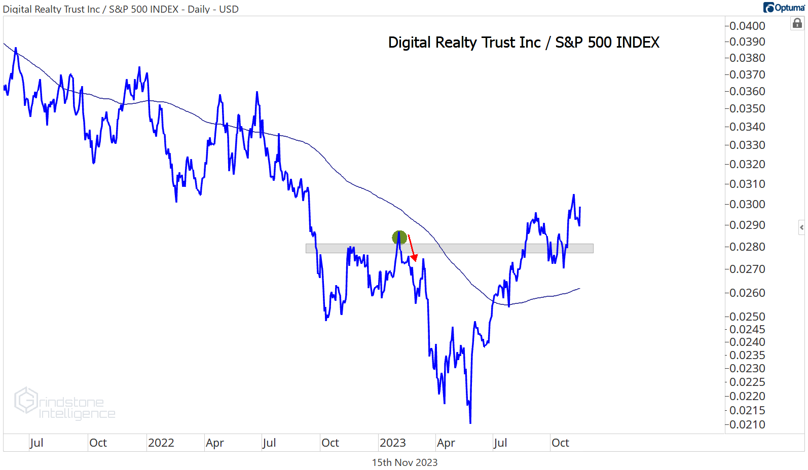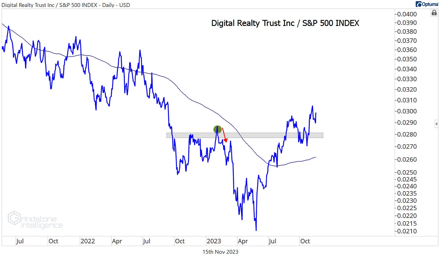 We like the relative strength in DLR even more. Compared to the S&P 500, it successfully challenged former resistance from last fall, and it’s continued setting higher highs and higher lows.