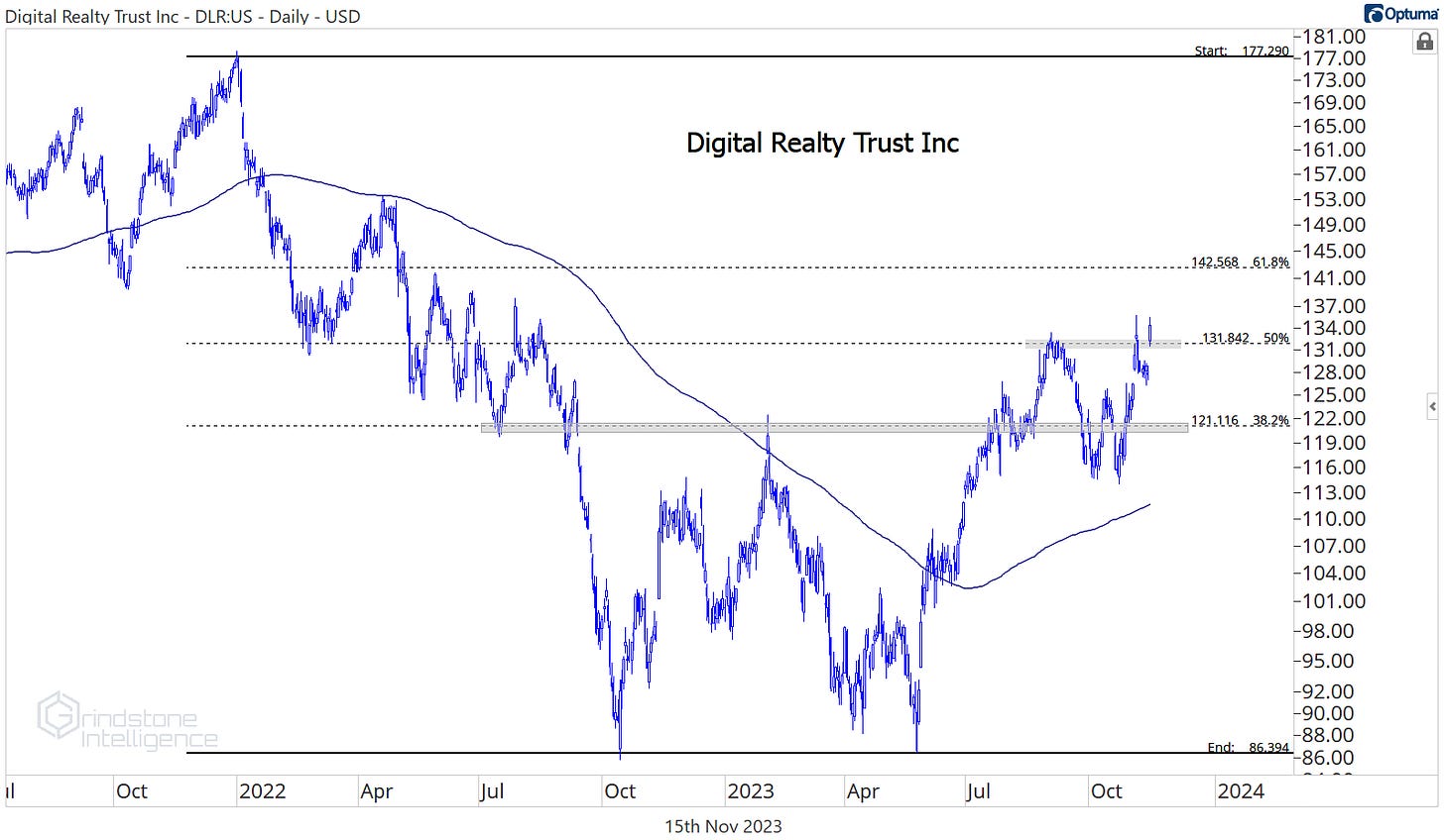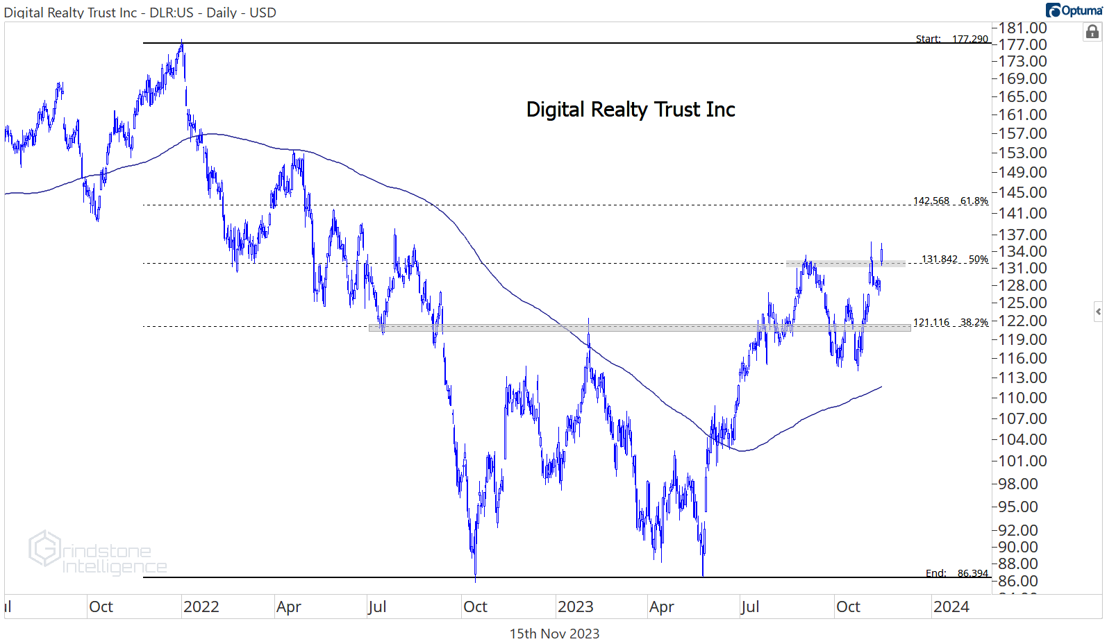 Digital Realty Trust is the big winner there, as it just climbed past the 50% retracement level from the entire 2022 decline. We like owning DLR above $130 with a target of $142, which is the 61.8% retracement from last year’s selloff.