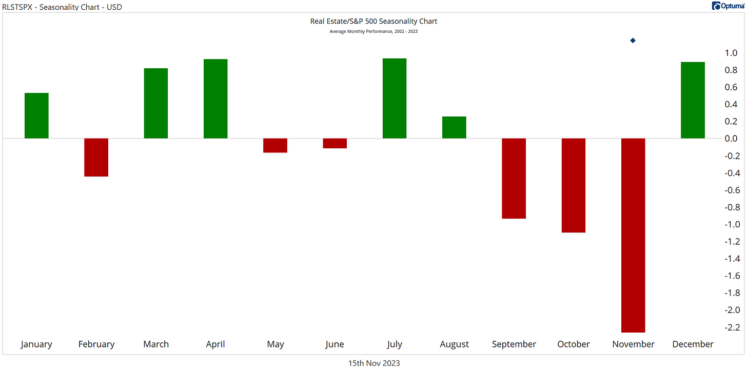 If that first step comes over the next few days, it would be in spite of a huge seasonal headwind. Historically, November has been the absolute worst month to own Real Estate.