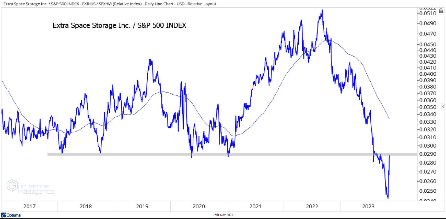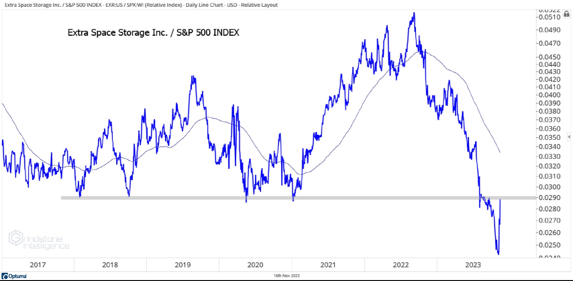 When compared to the S&P 500, though, EXR still has some work to do. It’s stuck below a level that was support from 2018-2021 and now will likely act as stiff overhead supply. We only want to approach EXR from the long side if it’s above these former lows on a relative basis.