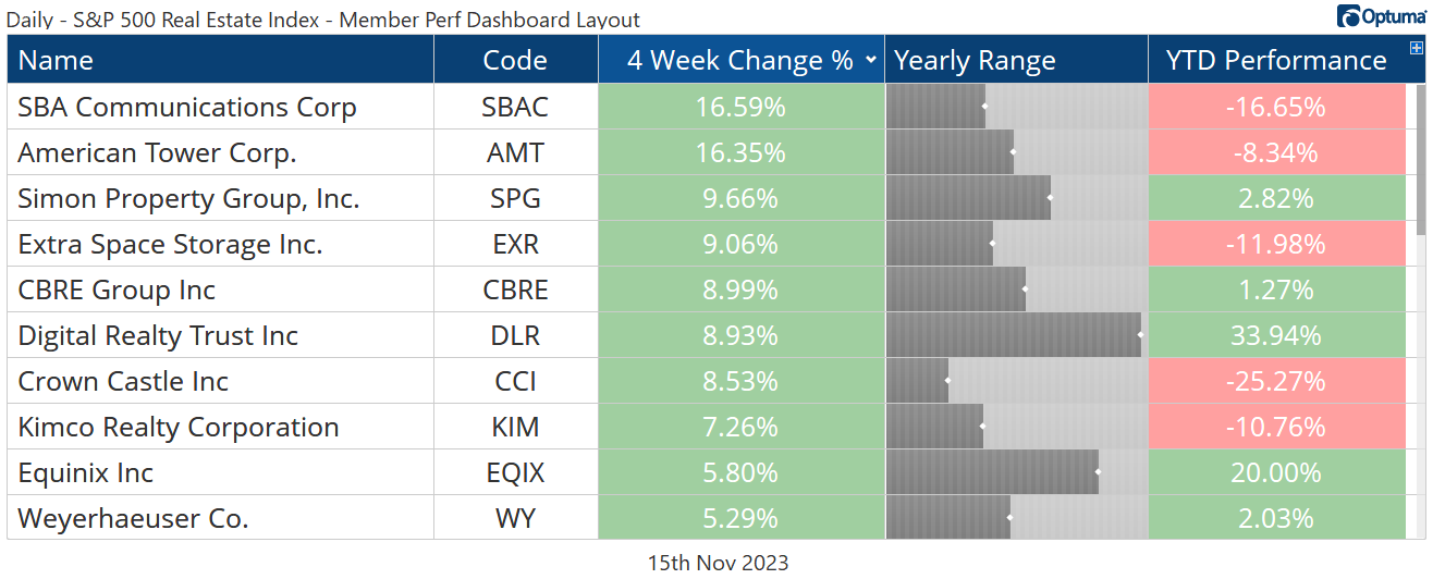 SBA Communications was the top performer over the last 4 weeks after being one of the worst heading into October. We’re keeping a close eye on SBAC because we think how it handles this key area of former support will have big implications for the future of the Real Estate sector overall.