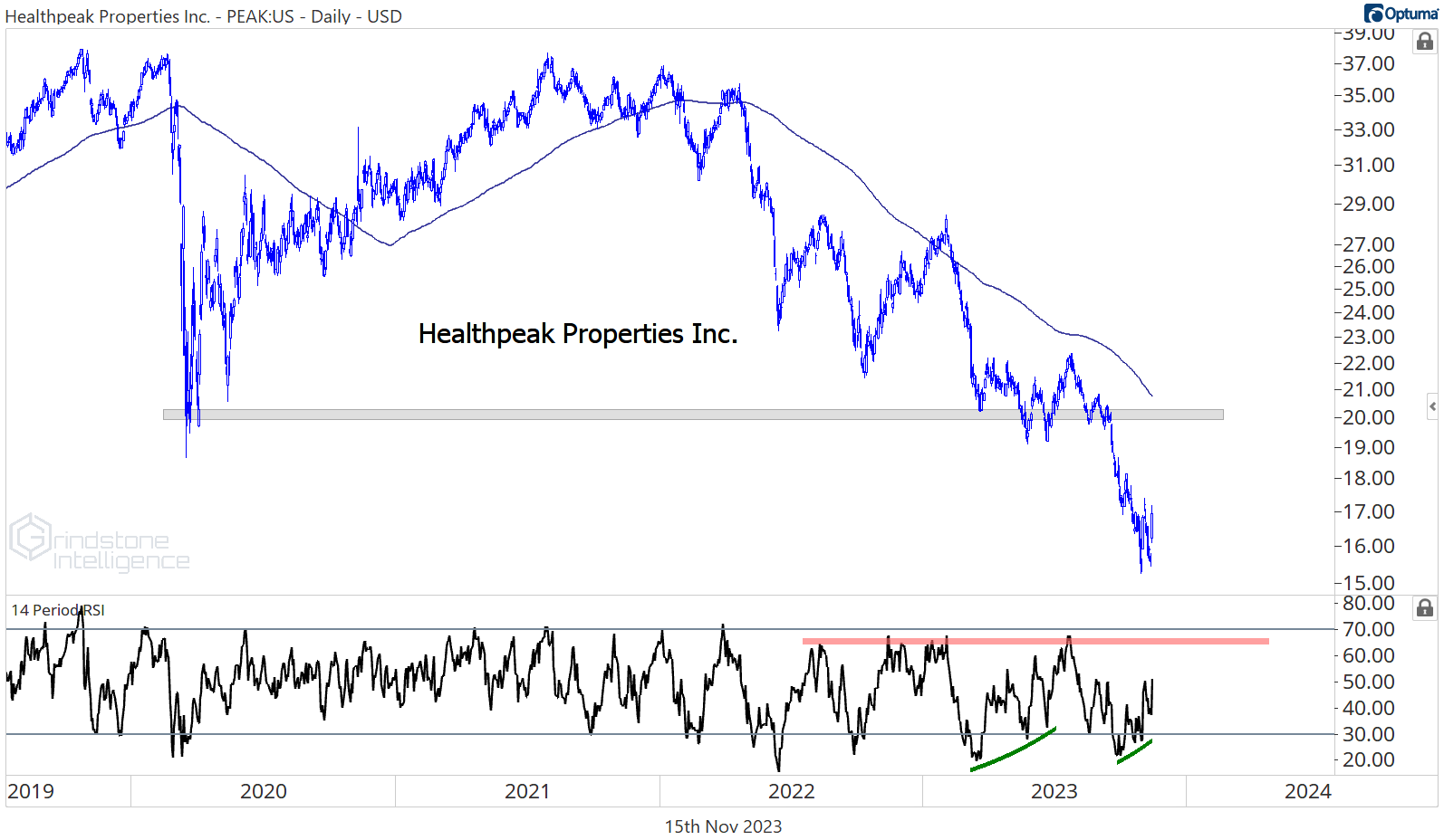 One stock that hasn’t participated in the rally is Healthpeak Properties. This one’s been stuck below a falling 200-day moving average for the better part of 2 years, momentum is in a bearish range, and it’s beneath the major lows that were set back in March 2020. Nothing about this chart says ‘uptrend.’