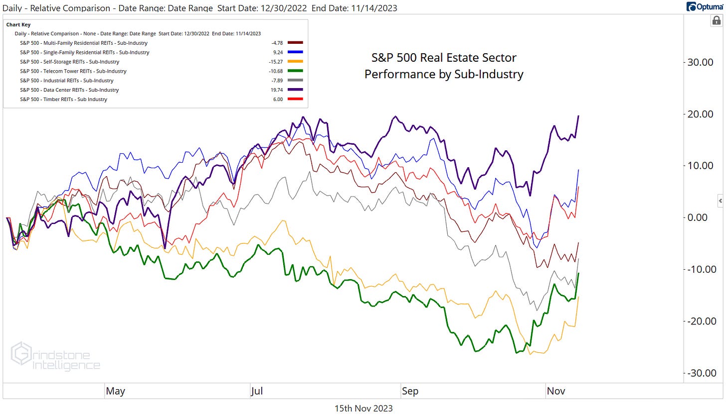 Only a few Real Estate stocks are knocking on the door of new 52-week highs, but one sub-industry is. Data Center REITs have been a leader all year, and they’ve jumped 15% from their October lows.