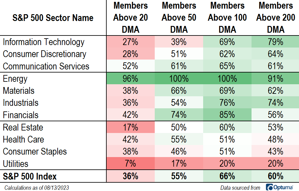 Trends are healthiest in the Energy sector. More than 90% of members are above moving average prices – no matter the timeframe. Risk-off areas like Utilities, Consumer Staples, and Health Care are the most weakly positioned. Compared to their long-term averages, the majority of stocks in each of those sectors are in technical downtrends.
