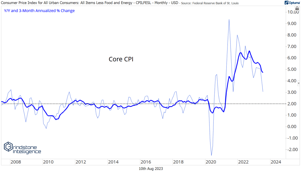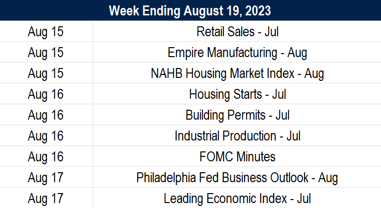 Inflation data continued to show positive developments in last week’s report. Even though CPI rose modestly from the prior month’s 3.0% year-over-year print, the 3.2% reading was still better than most analysts had forecast. The increase didn’t shift expectations for short-term interest rates, either. Futures markets indicate that the Federal Reserve will almost surely hold rates constant at next month’s FOMC meeting and that they’re most likely finished hiking interest rates for the year. Still, there’s quite a bit more data to come before the Committee meets again. Hawks argue that core inflation is still well above the Fed’s 2% annual target. Doves can point toward shorter-term measures of core prices: the 3-month annualized Core CPI dropped all the way to 3% in June.