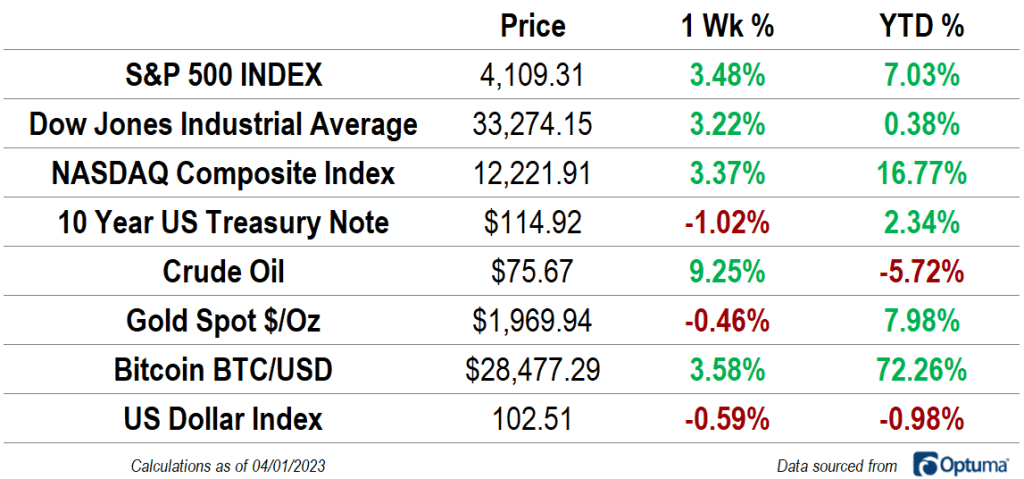 Stock prices soared last week, ending the first quarter on a high note. All three of the major US indexes are in positive territory for the year, led by the NASDAQ Composite, which is up 16.8%. Crude oil volatility continues, as prices jumped 9.25% to $75 per barrel. Bitcoin jumped 3.6% to close near its highest levels of the year, while gold gave back some of last week’s gains. The US Dollar Index fell for the third straight week, and interest rates rose.