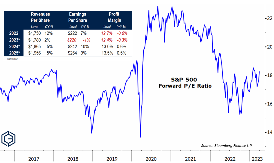 So far, 2023 has been the opposite experience: stock prices are rising, but earnings are not. In fact, consensus expectations for future earnings are falling. At the beginning of the year, analysts expected 7% EPS growth in 2023. Now they expect earnings to decline. The result is that valuations are elevated once again. The S&P 500 currently trades at a forward multiple of more than 18x.