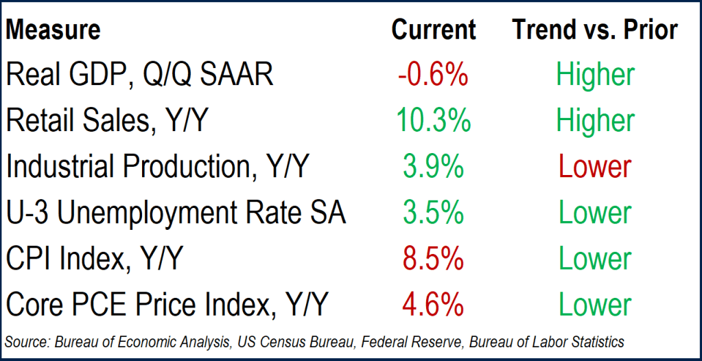 GDP has fallen for two consecutive quarters, satisfying a widely used rule of thumb for defining recessions, but we still don’t have confirmation of the downturn from the NBER, the nation’s official arbiter of recessions. Notably, 2Q GDP was revised significantly higher on the back of strong consumer spending.