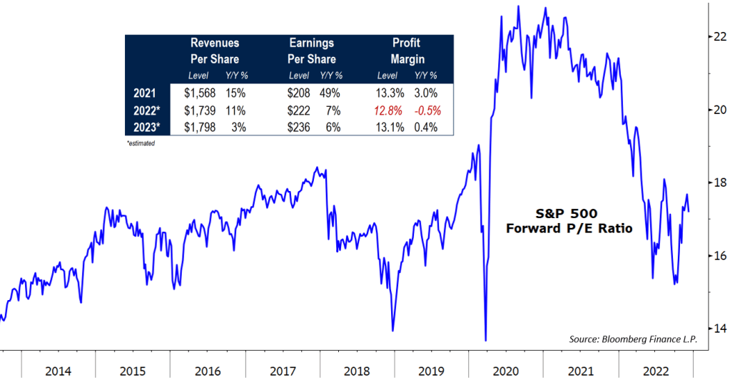 This year’s market selloff has not been matched by a proportionate decline in earnings expectations. That’s driven the S&P 500’s forward price-to-earnings ratio from a historically elevated level of 23x to 17x, which more closely aligns with the average over the last 30 years.