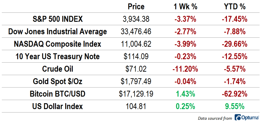 Asset prices were back under pressure last week as the Nasdaq Composite led stocks lower, dropping 4%. The S&P 500 Index fell 3.4% to close 17.5% lower for the year, and the Dow Jones Industrial Average slipped 2.8%. It’s still the best performing of the major US indexes in 2022, down less than 8%. Crude oil saw a significant weekly decline, dropping 11.2% as the US Dollar and interest rates both rose. The Dollar is nearly 10% higher on the year. Gold was mostly unchanged, ending the week near $1800. Bitcoin prices managed to rise more than 1%, but the cryptocurrency is still down more than 60% for the year.