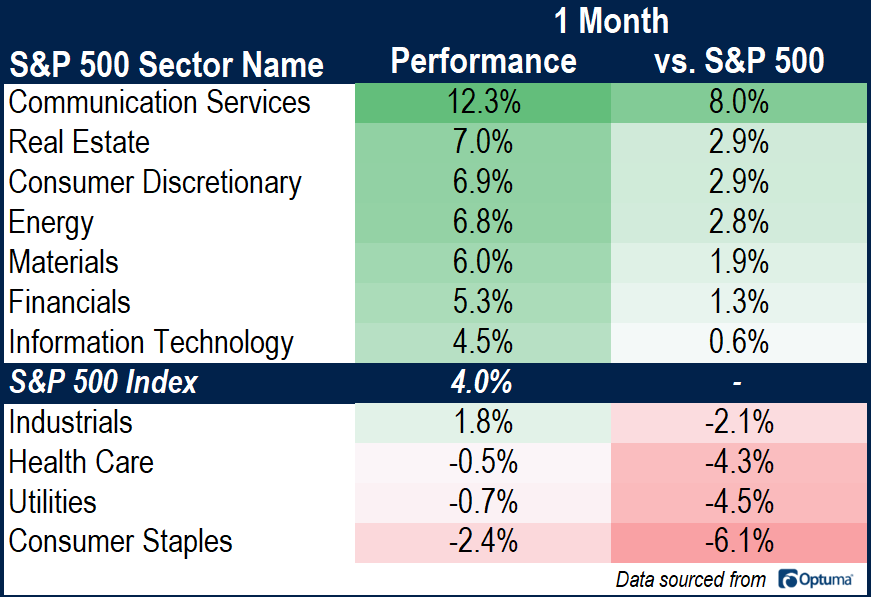 Risk-on sectors are outpacing risk-off areas of the market over the past month. Communication Services has risen 12%, while Real Estate, Consumer Discretionary and Energy are all up nearly 7%. Consumer Staples, Utilities, and Health Care, meanwhile, all posted negative returns.