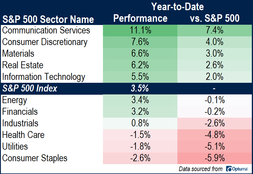 Year-to-date performances are largely the same. Growth-focused sectors like Communications, Consumer Discretionary, and Technology are outperforming the broader index, while safety and value-oriented sectors are lagging. It’s the inverse experience of 2022, when growth stocks led the market selloff.