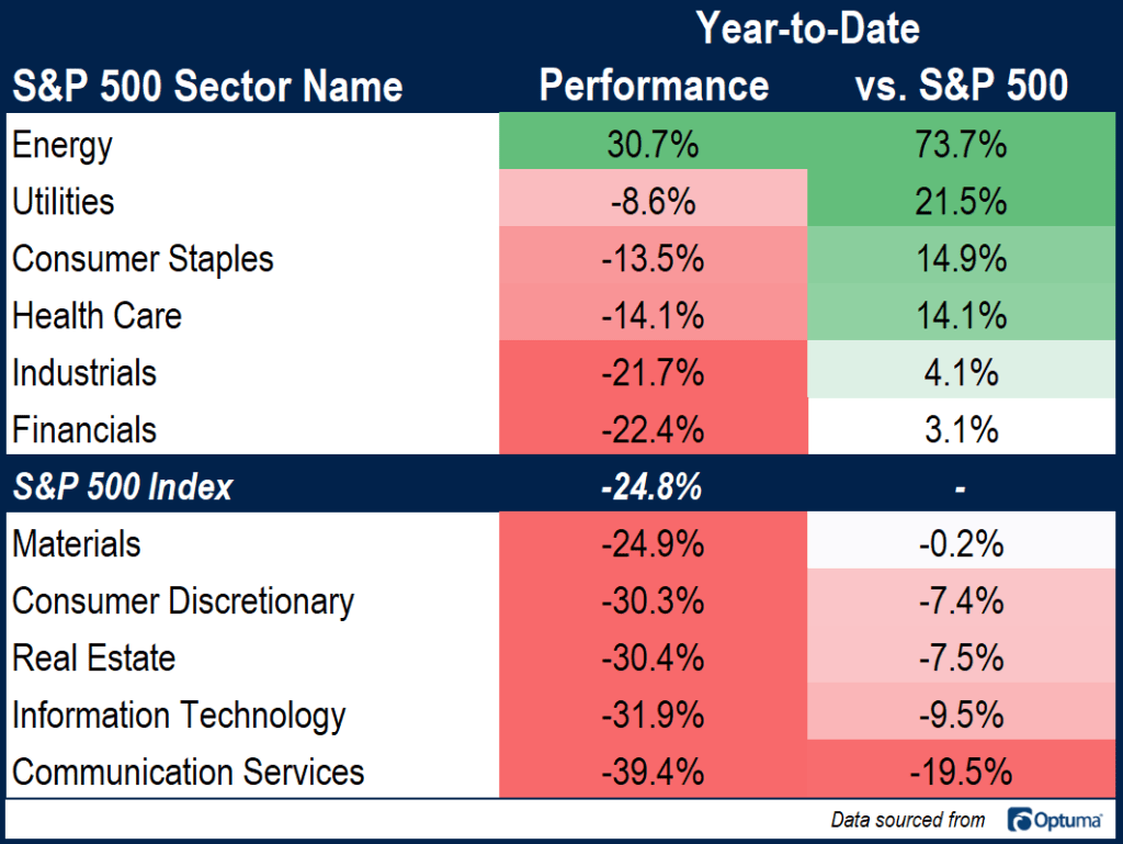 For the year, Energy is still the top performing sector, up more than 30%. That’s bucked the trend set by other cyclical sectors, which are all down more than 20% in 2022. Technology and tech-like groups have seen the most damage, while sectors that are less exposed to economic activity have outperformed.