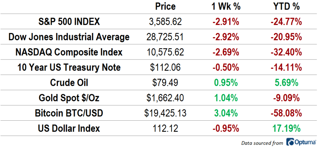 Stocks fell for the sixth time in seven weeks, finishing the week at the lowest levels since 2020. The S&P 500 Index is now down almost 25% for the year, and the Nasdaq is down more than 30%. Notably, stocks fell even as the US Dollar weakened almost 1% – the Dollar is still 17% higher in 2022. Commodities did well on the week, with Crude oil rising 1% to just under $80 per barrel. Gold climbed 1% as well. Bitcoin jumped 3%, but remains one of the worst-performing asset classes on the year. Treasury yields rose, with 10-year Treasury Notes falling 0.5%.