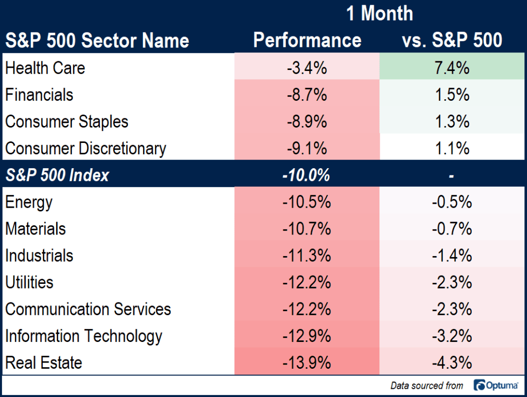 It was hard to generate positive returns over the last month, as no sector turned in a positive performance. Health Care was far and away the best place to hide, as it outperformed by 7%. Financials and Consumer stocks fell less than the index in September, while Real Estate and Information Technology lagged the most.