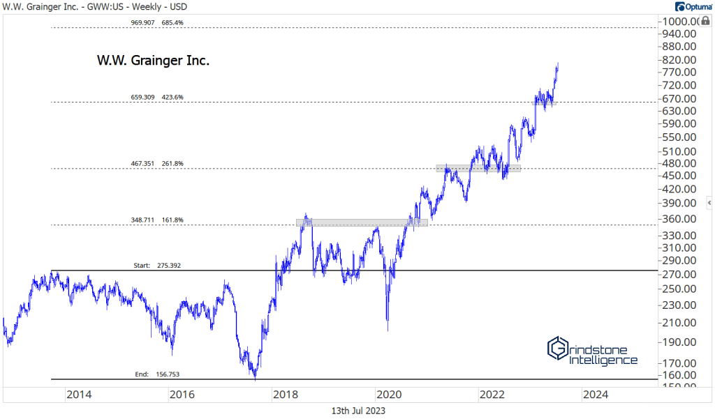 Speaking of stocks that have surged, how about the rally in Grainger? It won’t get there overnight, but we think Grainger eventually heads to $970, which is the 685.4% retracement from the 2013-2017 decline.