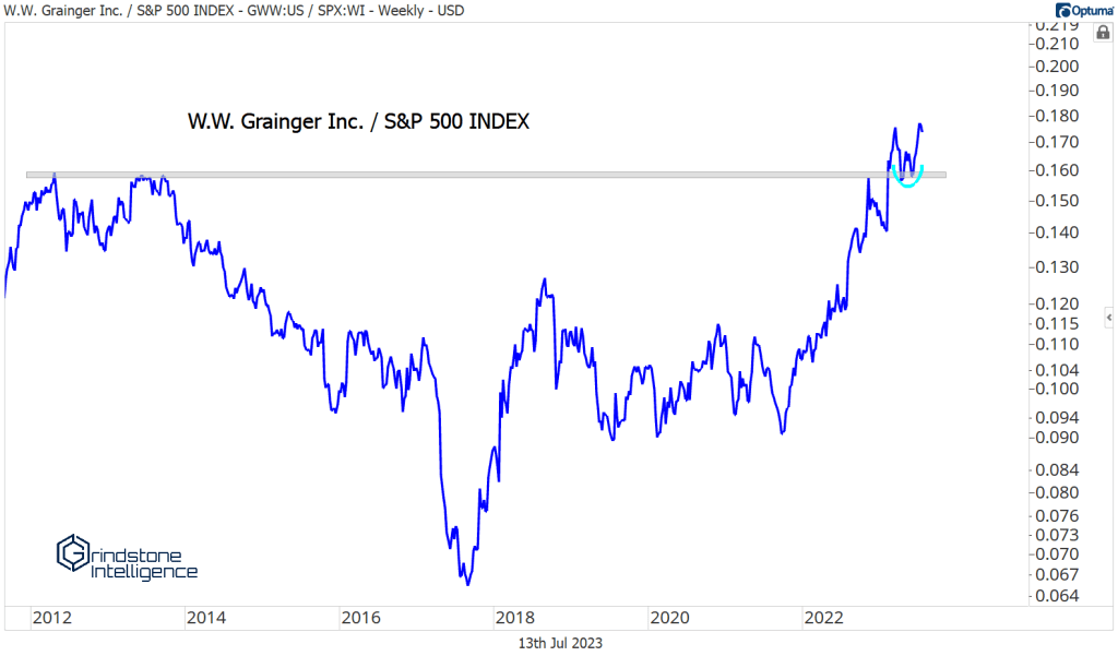 Backing our view is how the stock is performing against the S&P 500. It spent 10 years(!) trying to get back to the relative highs it set in 2012. It failed at those former highs last October, then pushed above them in January, and successfully backtested them in April and May. It may take a few months to digest the recent gains, but structurally, GWW is in a long-term uptrend on both a relative and an absolute basis.