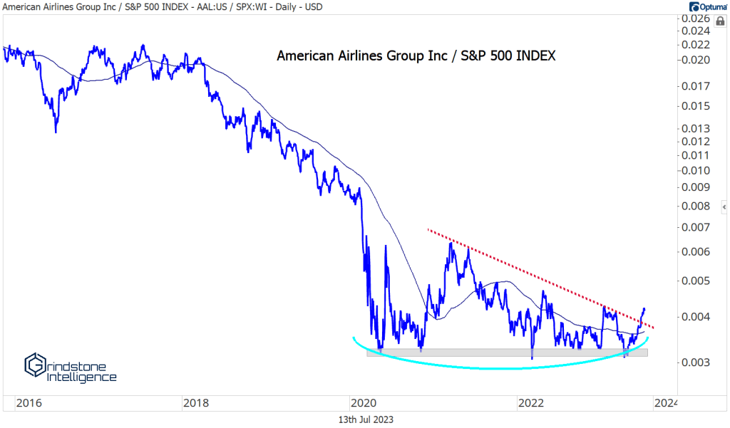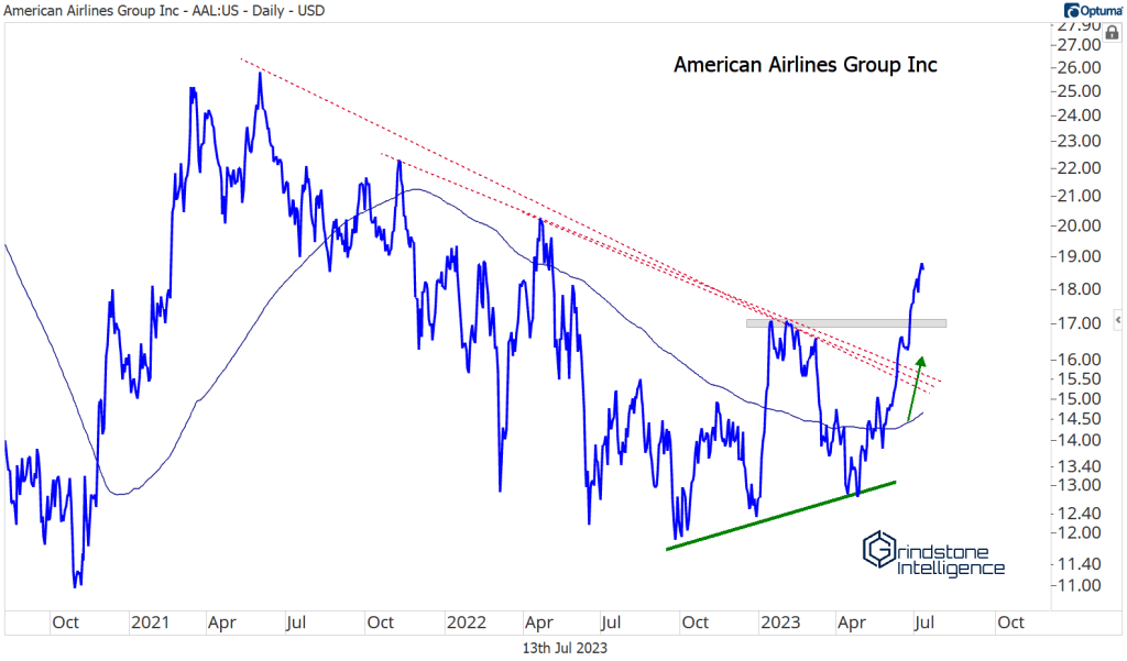 The top-performing industry of late has been the airlines. There are 3 necessary steps in reversing a downtrend: set higher lows, break the downtrend line, then set higher highs. American Airlines broke downtrends no matter how you drew them, and now it’s at new 52-week highs.
