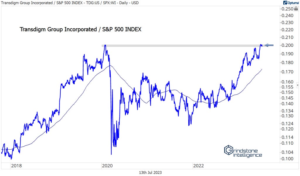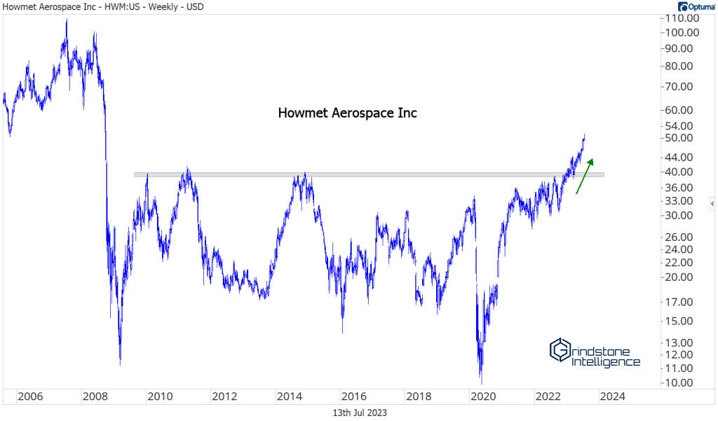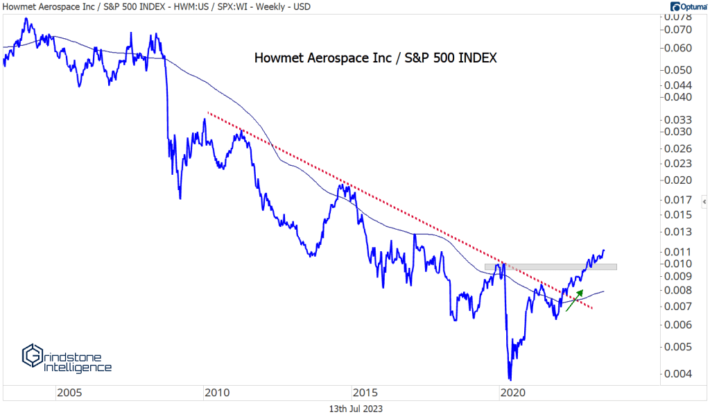 Why else is HWM on our radar? Because it’s showing relative strength. The stock is reversing a two decade downtrend relative to the S&P 500. First it cleared the 200-week moving average, then the downtrend line, and now it’s setting a higher high. That’s all the checkboxes for a new uptrend.
