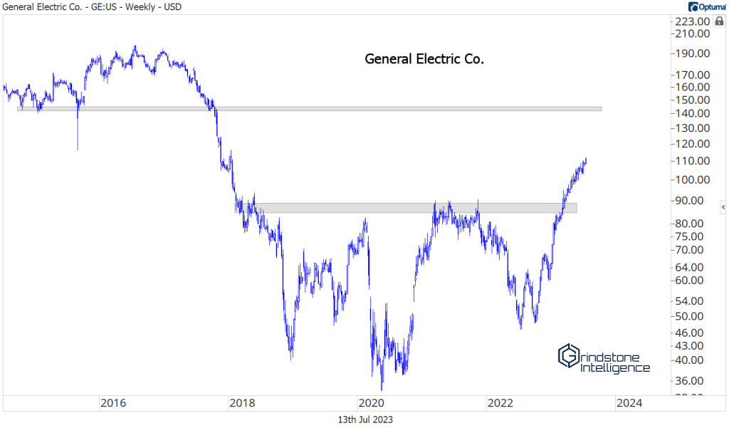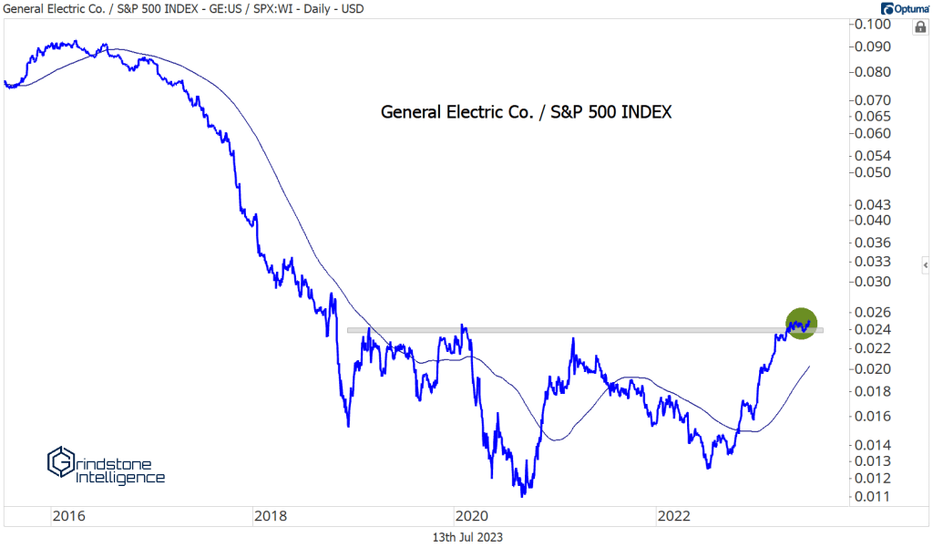 In the meantime, check out GE. Have we mentioned how much we love relative strength? It’s setting multi-year highs against the S&P 500 after reversing a huge downtrend.