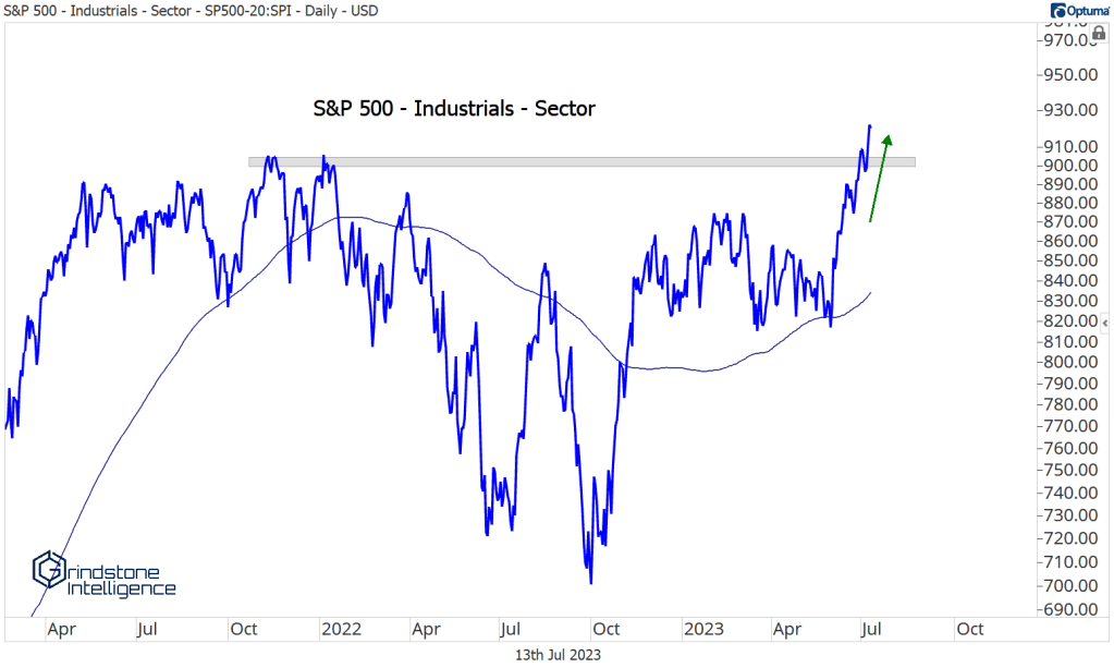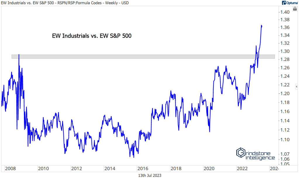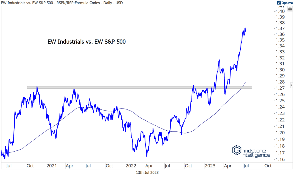 The breakout in Industrials came quickly, but it didn’t come as a surprise. We’ve been highlighting the underlying strength within the sector all year with this chart of the equally weighted sector vs. the equally weighted S&P 500. Strip out the influence of the mega caps, and the Industrials have been outperforming all year.
