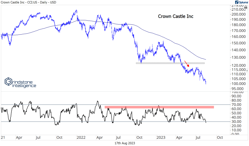 Crown Castle has been even worse since breaking down at the end of April. Momentum is clearly in a bearish range, and the stock hasn’t challenged its 200-day moving average since dropping below it exactly one year ago.